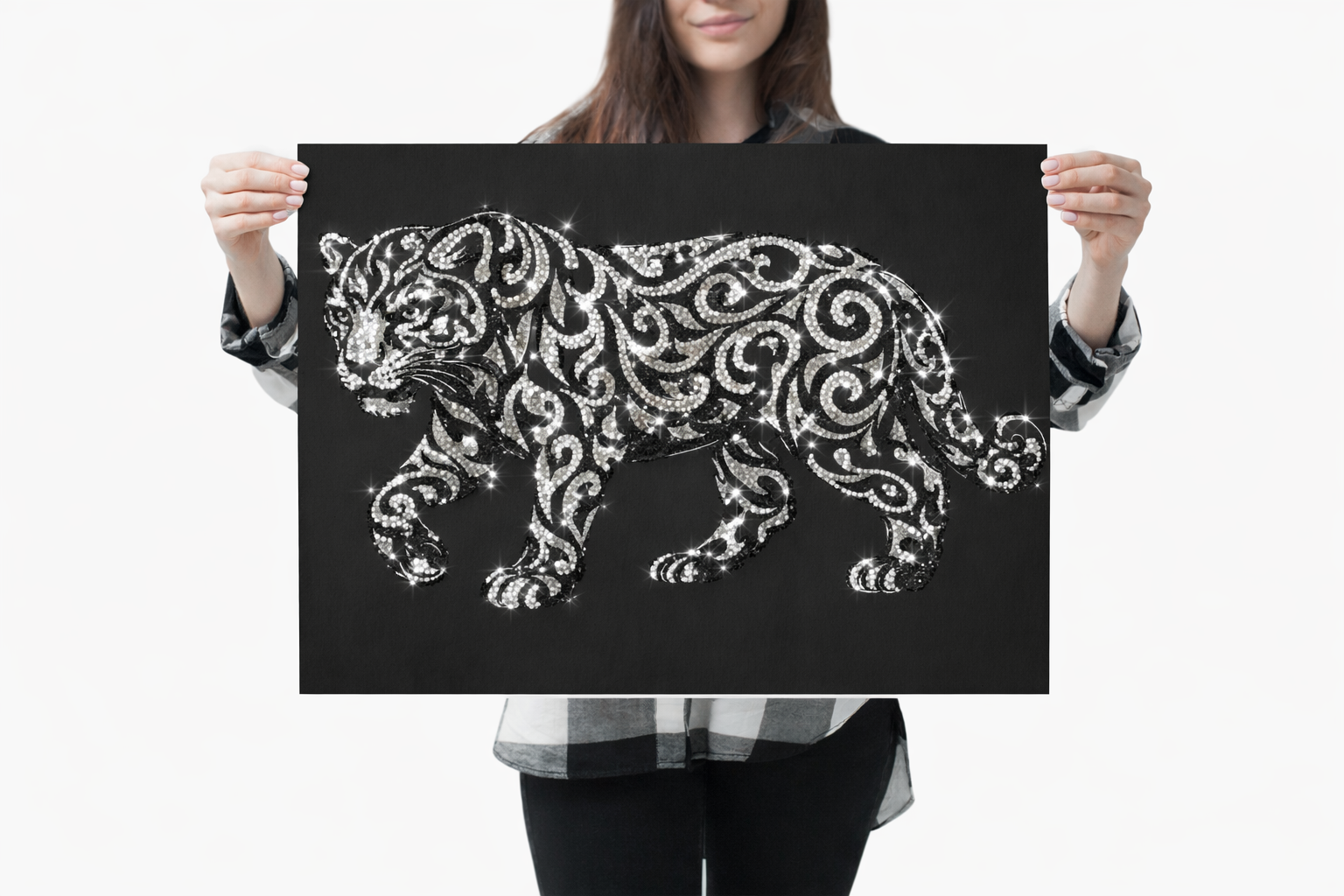Meet Kairo — a sleek embodiment of strength and motion, where timeless black-and-white design becomes a stage for luminous sparkle. Once rhinestoned, each flowing pattern along the prowling form catches the light, creating depth, contrast, and quiet power. Designed for artists who want a bold, confident statement canvas that transforms into refined, elevated art.