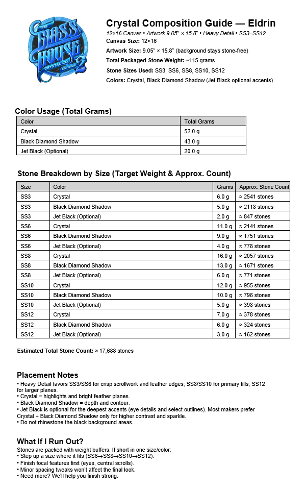 Stone counts vary by design and canvas size. Each listing includes an estimated stone count by size and color in the product photos to help you plan your stash or purchase exactly what you need — with a little extra for sparkle freedom. A digital download of the stone guide will be available to you free of charge after checkout.